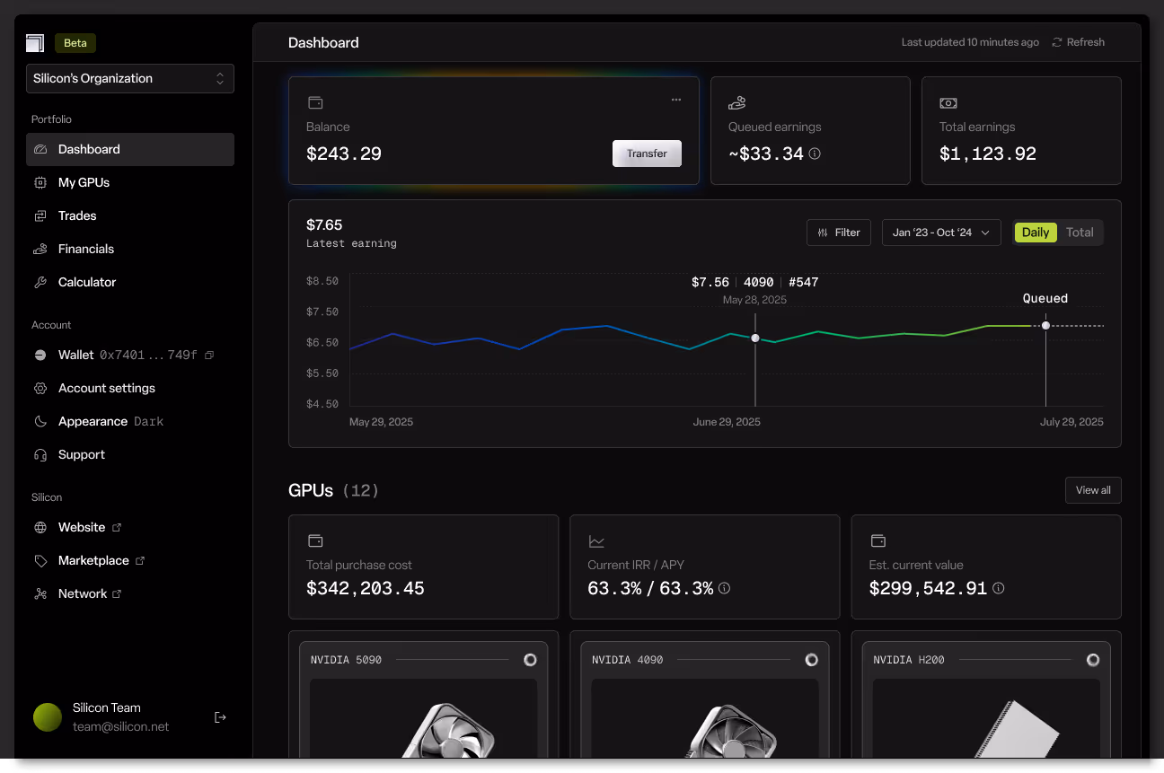 Welcome to the Silicon Network Owner Dashboard documentation. This guide helps GPU NFT owners monitor their assets, track earnings, and manage their tokenized GPU portfolio.